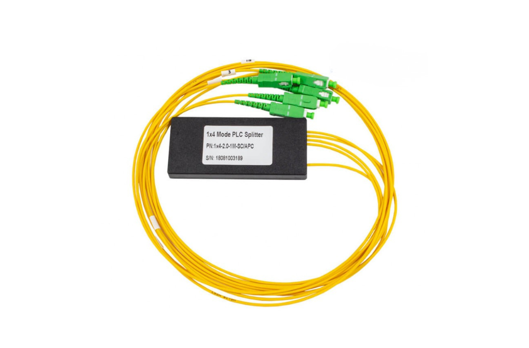 Divisor óptico PLC (circuito de luz planar) con 1 entrada y 4 salidas, tipo BOX MINI, con conector SC/APC, fibra G657A1, diámetro del cable 2 mm, longitud 1 metro y dimensiones 100x45x10 mm.